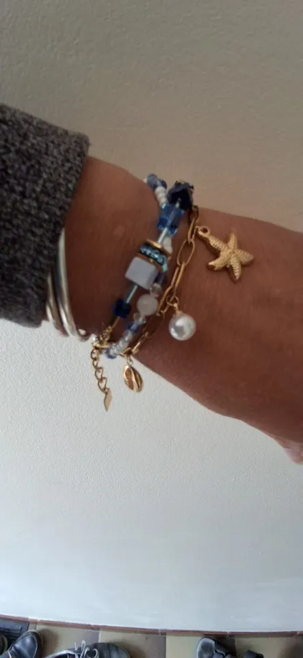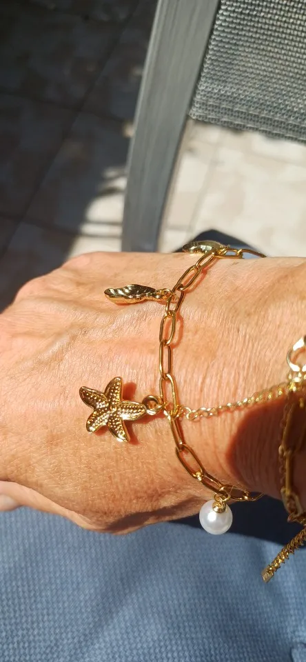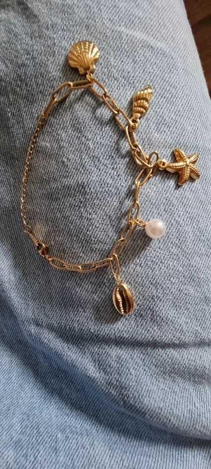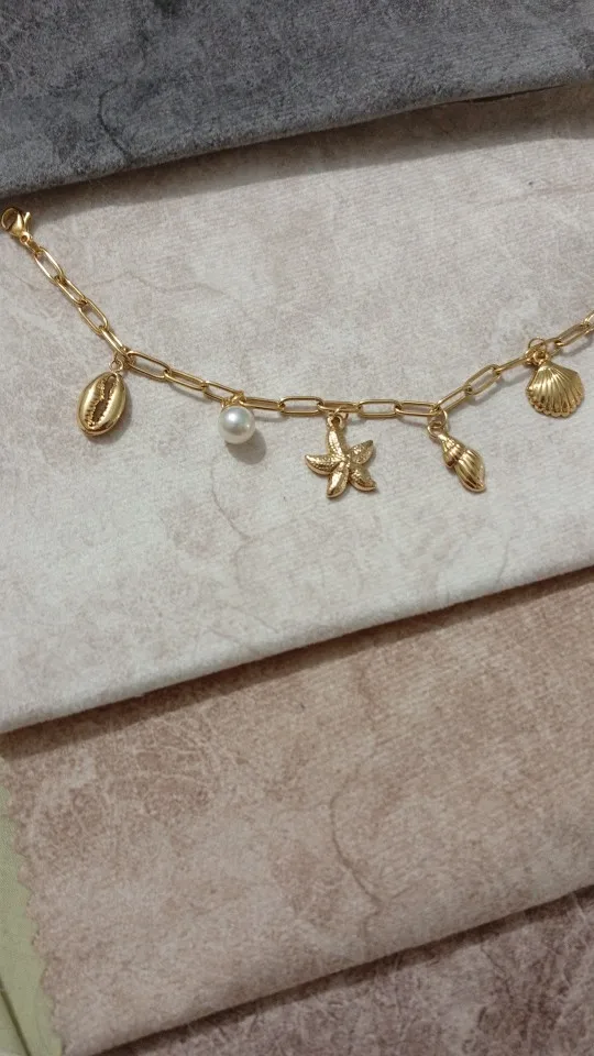 Elevate your style with the Shoreline Charms bracelet, crafted from durable stainless steel with a refined gold finish. This elegant piece features delicate starfish and conch shell charms, embodying the essence of coastal beauty. Designed for lasting wear and sophisticated fashion, it adds a subtle yet striking touch to any outfit. Perfect for those who appreciate timeless jewelry inspired by the sea.