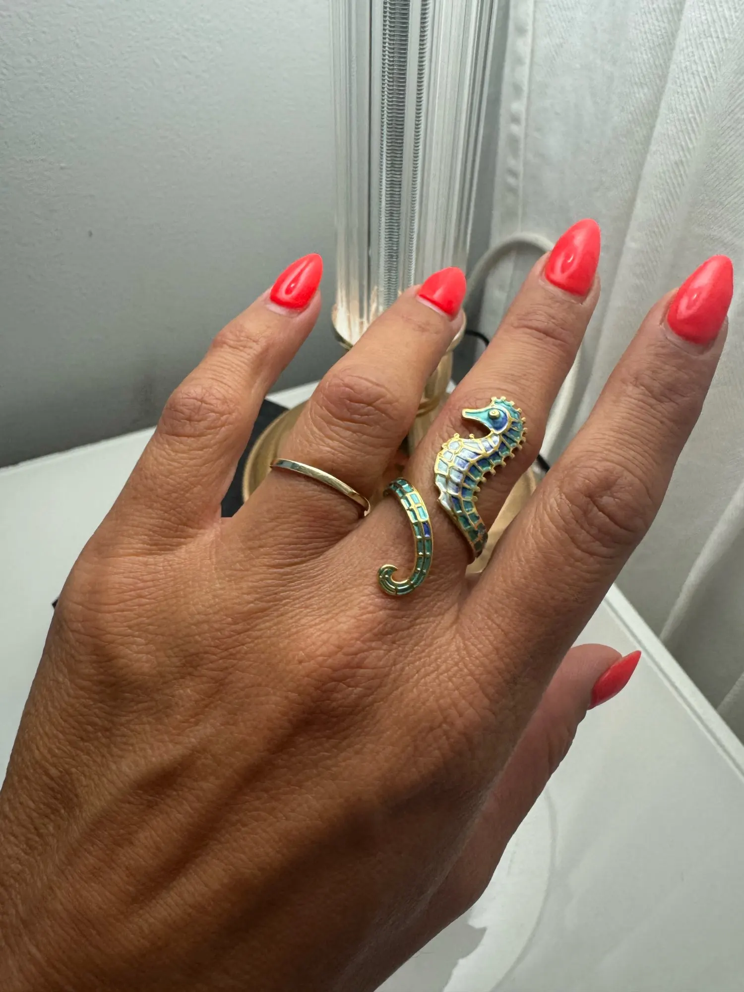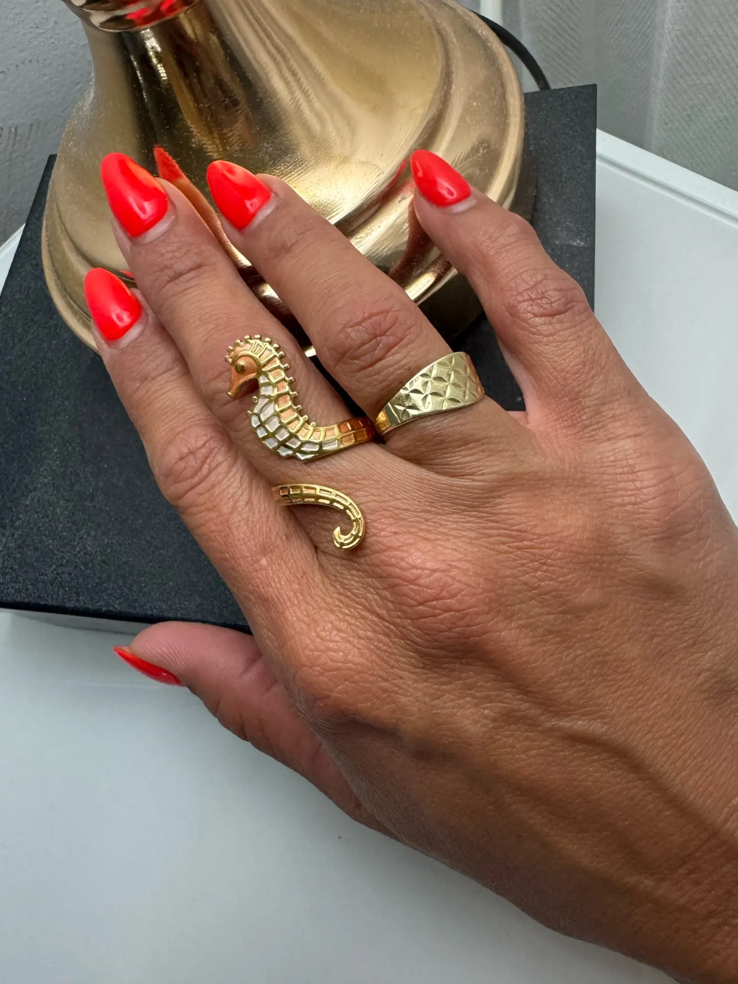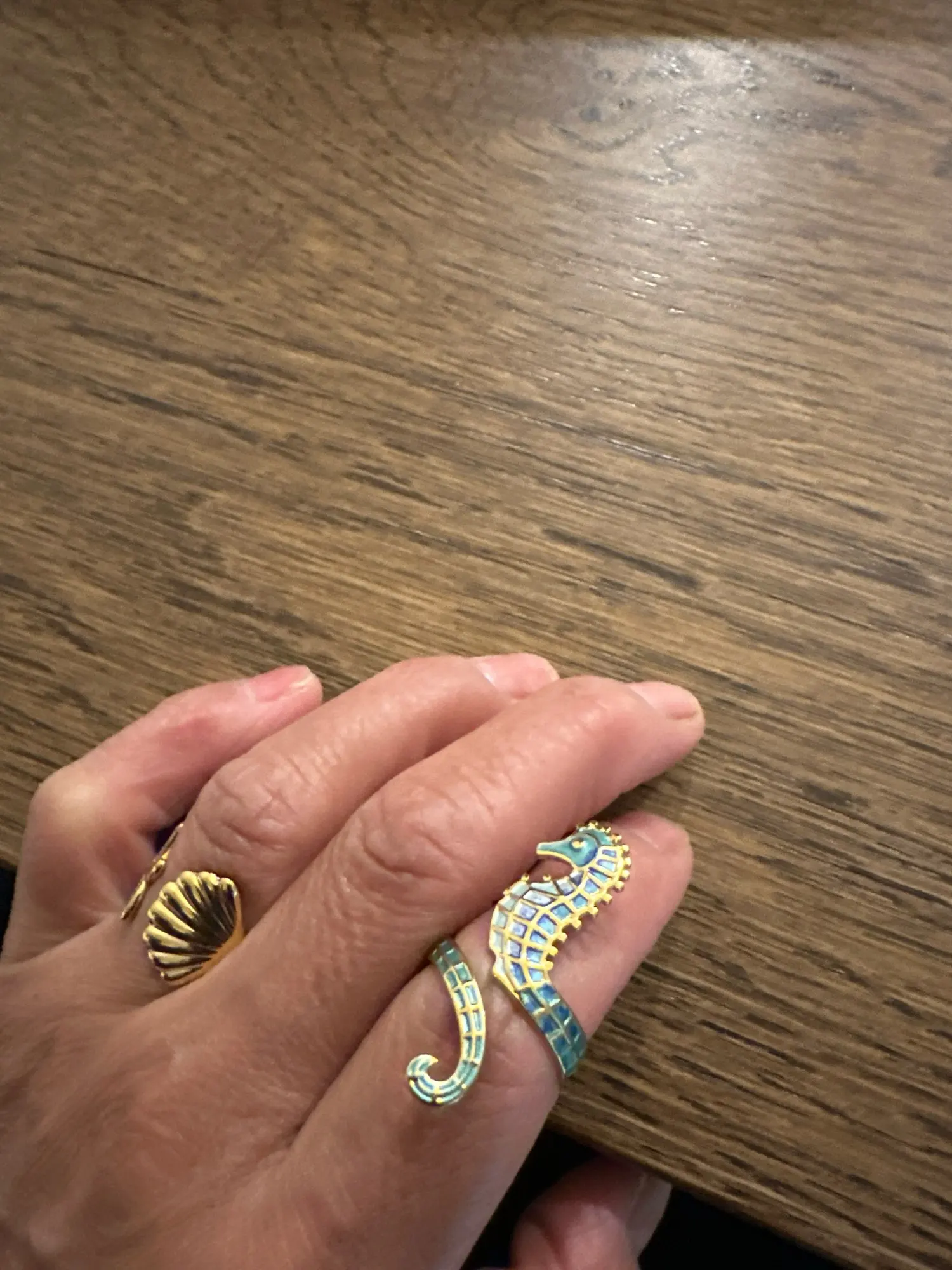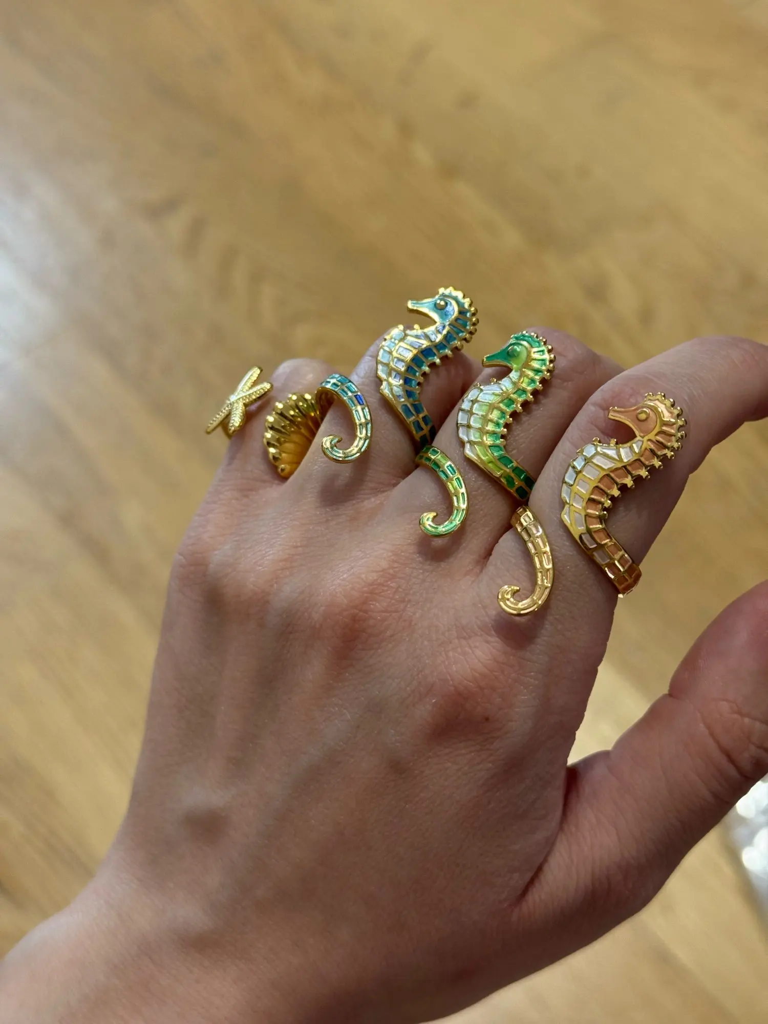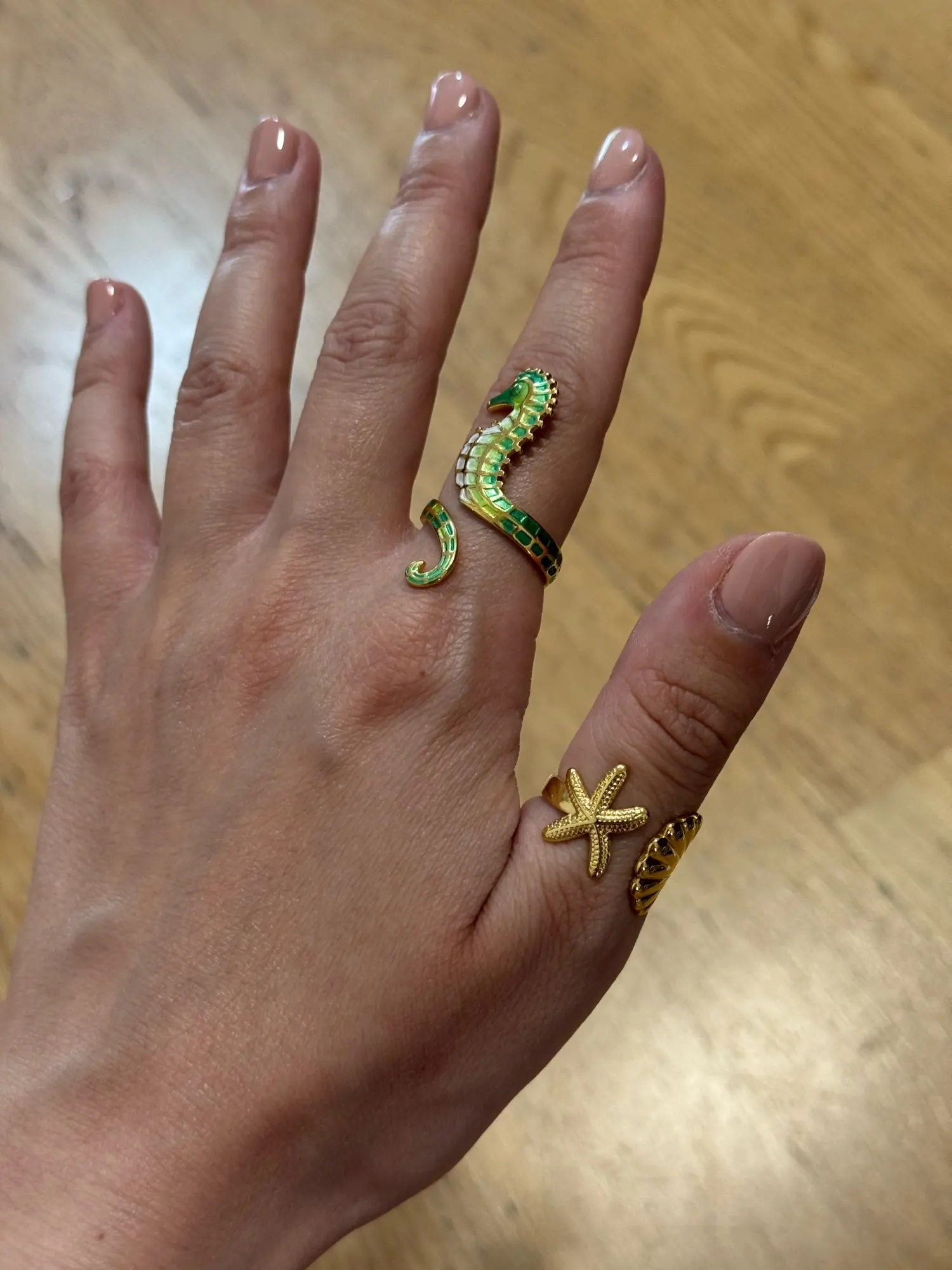 The Ocean Majesty Ring combines casual elegance with durable stainless steel craftsmanship. Featuring intricate sea star and seahorse motifs, this ring offers a subtle ocean-inspired touch to any outfit. Its simple yet refined design makes it an ideal accessory for everyday wear, enhancing your style with a unique, fashion-forward statement. Perfectly suited for those who appreciate delicate marine-themed jewelry with lasting quality.