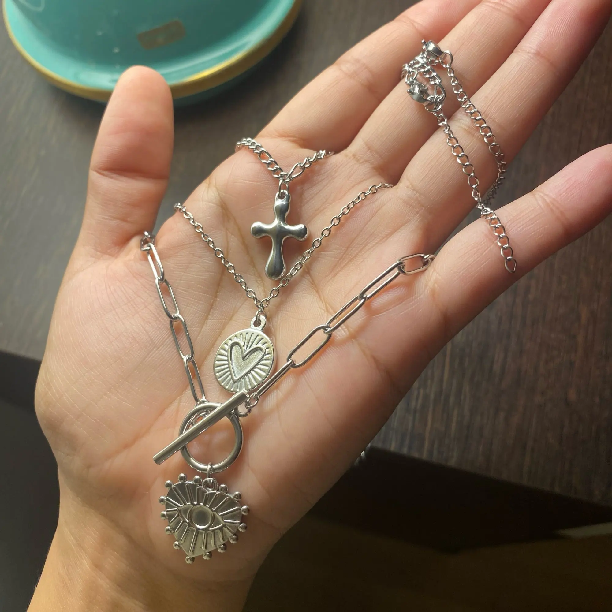 Elevate your style with the Eclipse Necklace Set, featuring a stainless steel collarbone chain that combines a heart, devil’s eye, and cross for a striking multi-element design. This versatile piece is perfect for both daily wear and special occasions, offering a unique balance of edgy and elegant. Durable and hypoallergenic, it ensures long-lasting comfort and shine, making it an essential addition to any modern woman’s jewelry collection!