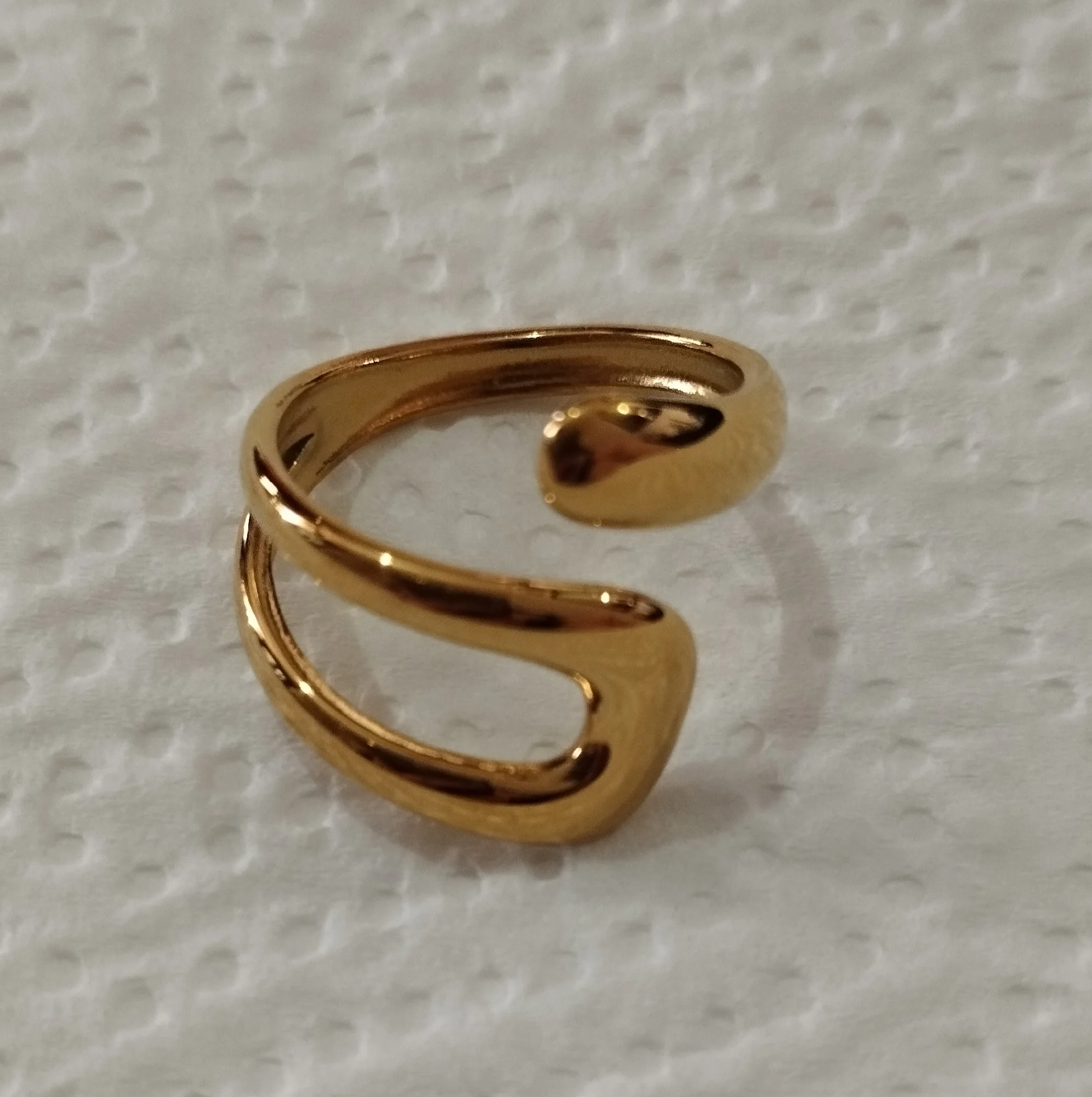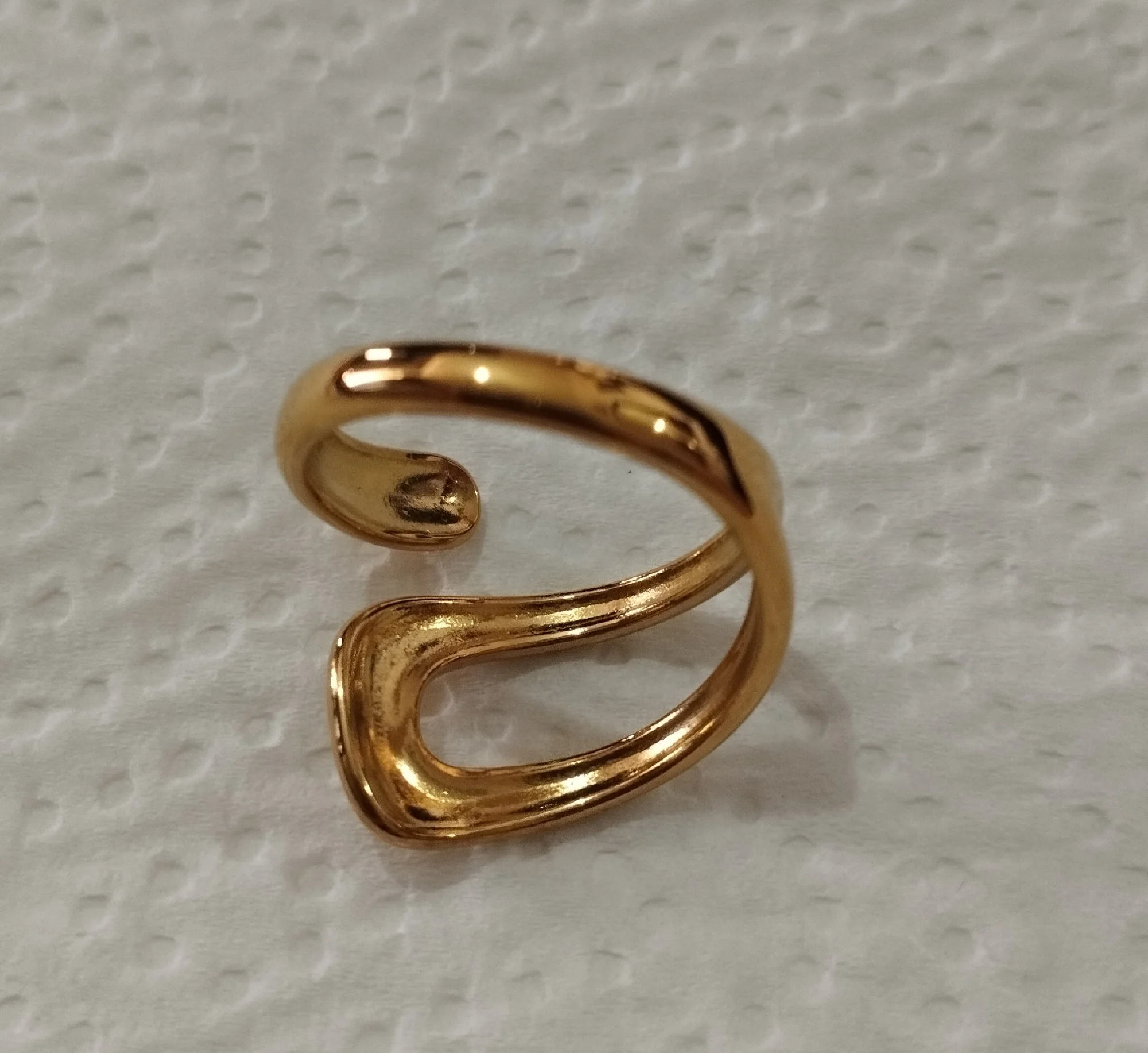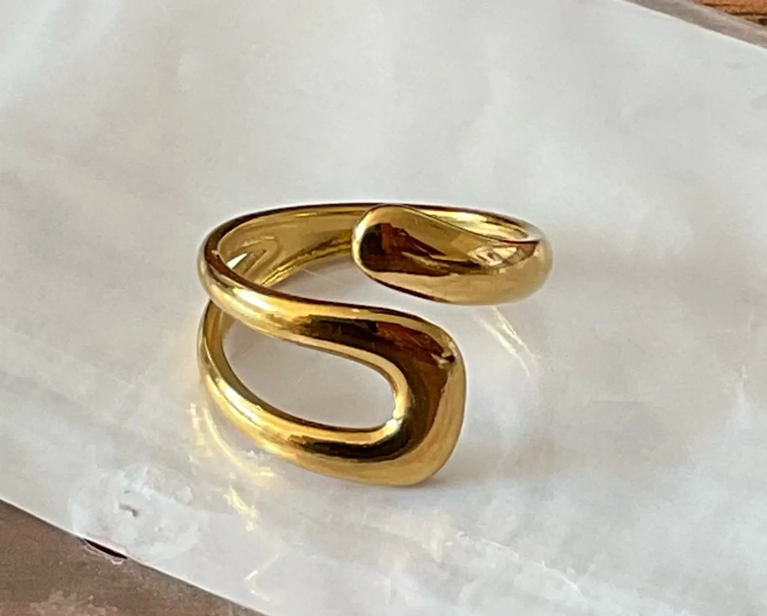 The Modern Muse Ring features a bold, geometric hollow design crafted from stainless steel with a layered wide band. Its textured metal surface offers a sophisticated golden hue that is both waterproof and durable, ensuring lasting style for daily wear. This ring blends simplicity with contemporary elegance, making it an essential accessory for the discerning woman.